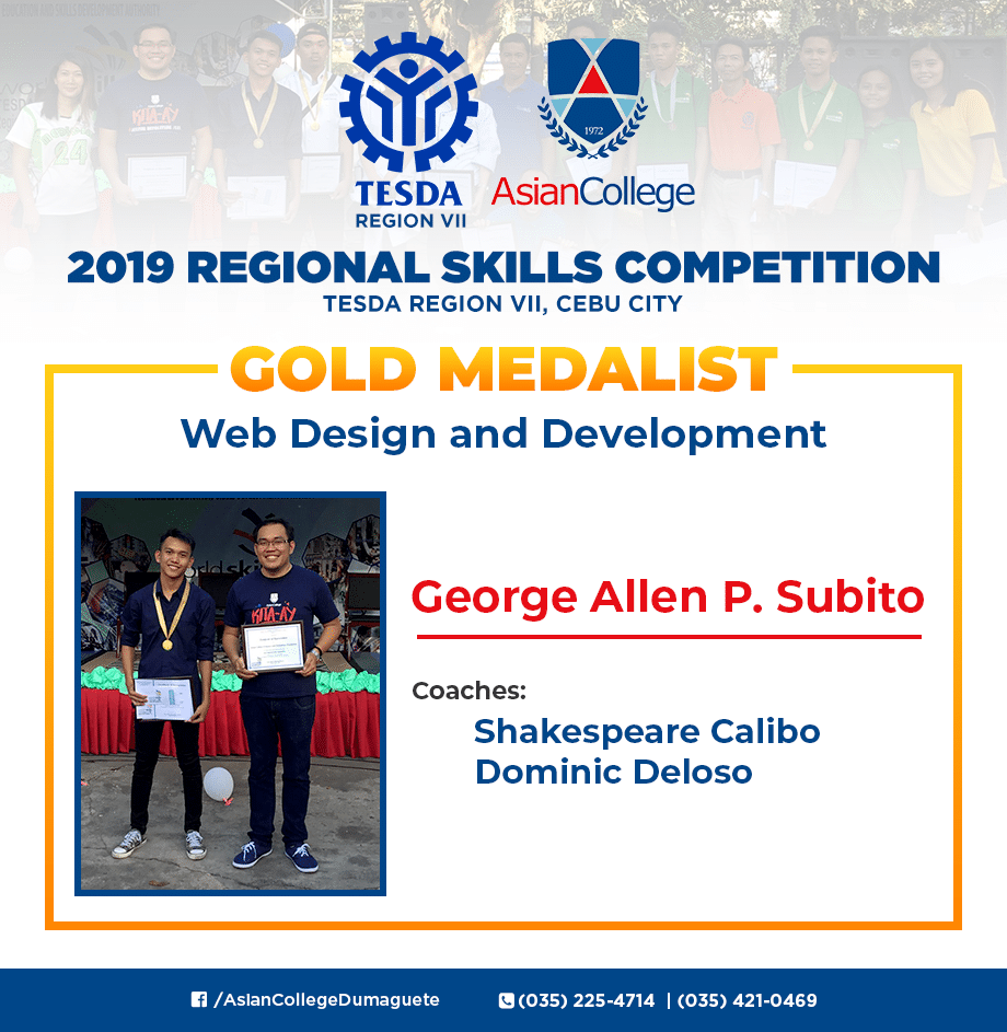 CONGRATULATIONS George Allen Subito who represented Negros Oriental Province for winning a Gold Medal in Web Design and Development Category during the 3-Day TESDA VII – Regional Skills Competition 2019. The competition was held in Cebu City last April 10-12, 2019. Mr. Subito will represent Region VII for the upcoming TESDA – Zonal Skills Competition … Read more